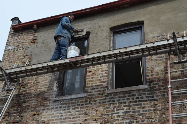 Sand finishing the damaged bricks and replacing gutters