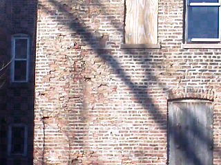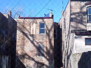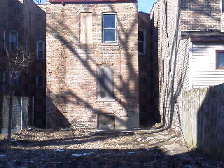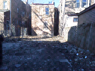 Here are some pictures of the backyard. Your eyes do not decieve you, there is a big ass satellite on the roof. The bricks are damage due to the broken gutter. Tuck point will be required, serious landscaping, garage, concrete walk path,and new fencing. Got a lot of work to do, turning this hangout spot for crackheads to a backyard oasis.