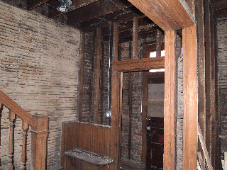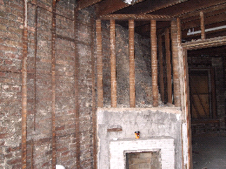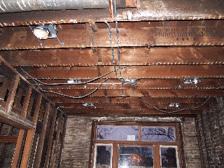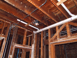 The main floor has been completely demo. As you see, the plumbing has been complete for the second floor. The copper pipes supply water to the second floor bathrooms. The PVC pipes are sewage and vent pipes. Some of the floor joints have been destroyed by the previous owner. Also, most of the can lights have been installed on the main floor.